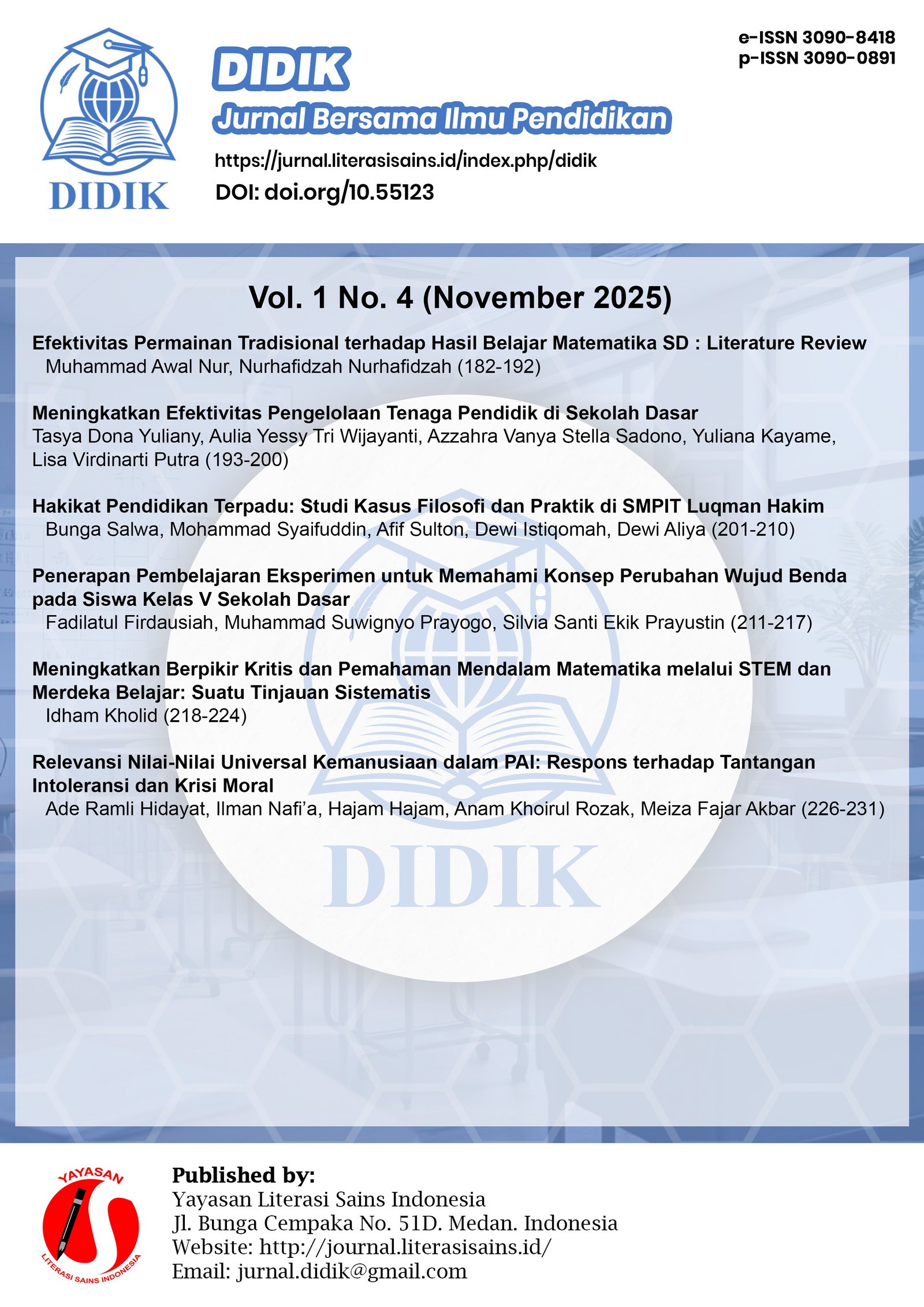Vol. 1 No. 4 (2025)Jurnal Bersama Ilmu Pendidikan, yang disingkat sebagai DIDIK, adalah jurnal ilmiah yang diterbitkan empat kali dalam setahun, yaitu pada bulan Februari, Mei, Agustus, dan November, oleh Yayasan Literasi Sains Indonesia. Jurnal ini berfokus pada publikasi hasil penelitian, kajian teoretis, dan tinjauan konseptual dalam bidang pendidikan serta pengajaran di semua jenjang pendidikan. Lingkup topik yang diangkat mencakup berbagai isu yang relevan, mulai dari pendidikan dan pengajaran di sekolah dasar, sekolah menengah, hingga pendidikan tinggi.