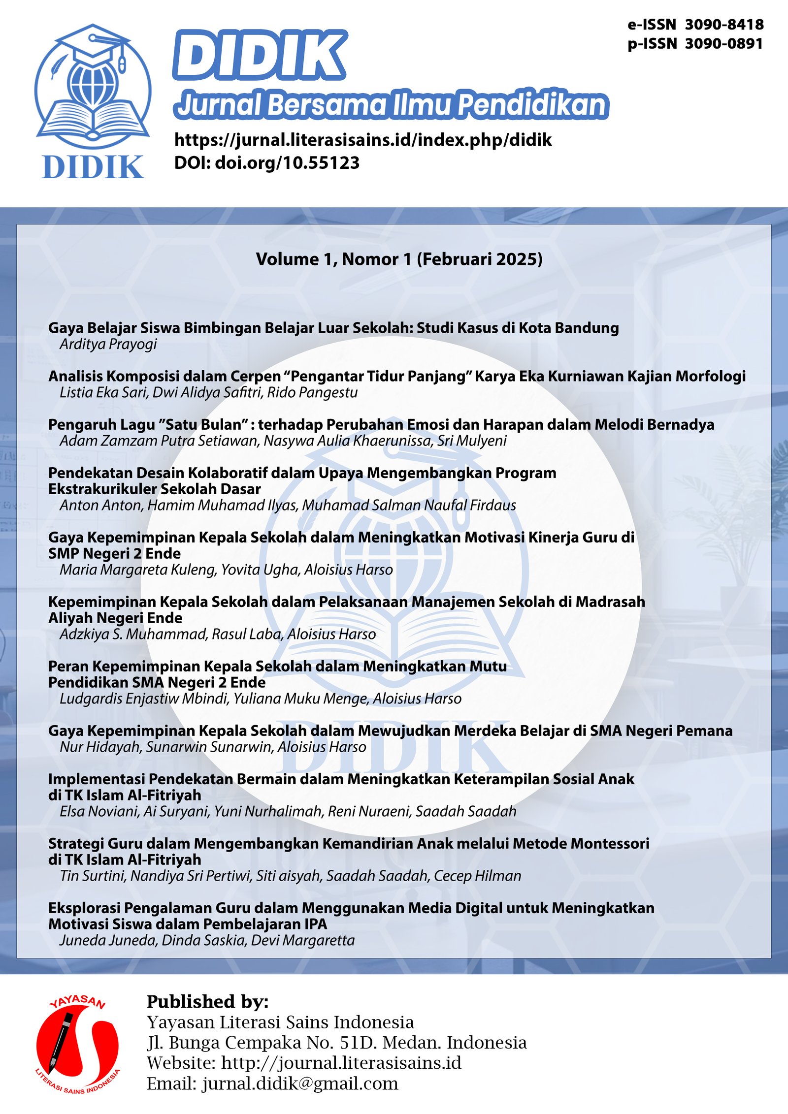 Vol. 1 No. 1 (2025)Jurnal Bersama Ilmu Pendidikan, yang disingkat sebagai DIDIK, adalah jurnal ilmiah yang diterbitkan empat kali dalam setahun, yaitu pada bulan Februari, Mei, Agustus, dan November, oleh Yayasan Literasi Sains Indonesia. Jurnal ini berfokus pada publikasi hasil penelitian, kajian teoretis, dan tinjauan konseptual dalam bidang pendidikan serta pengajaran di semua jenjang pendidikan. Lingkup topik yang diangkat mencakup berbagai isu yang relevan, mulai dari pendidikan dan pengajaran di sekolah dasar, sekolah menengah, hingga pendidikan tinggi.